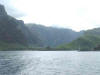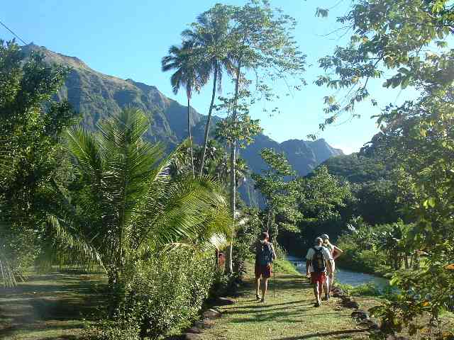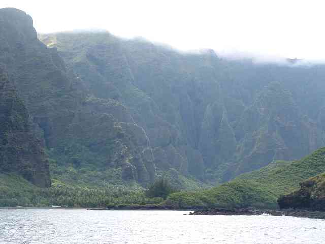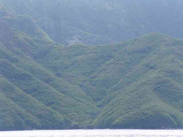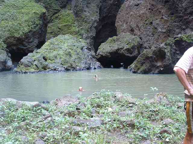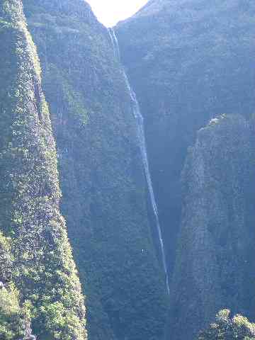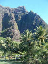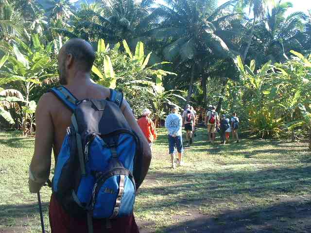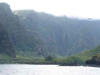 The bay does have no-nos, irritating bugs (sand flies) that bite without causing pain, or any sensation at all; however, some time later (12-36 hours), one discovers small red bumps that itch in an amazingly spectacular way as well. Except for Bill, who seems to have no reaction to them other than the red marks on his skin. We've been hitting him occasionally, to make up for what we're going through. Well, not really - we just want to. We're still doing well, although I've learned that when it rains, it pours and then it's very, very humid afterwards. I'm not a big fan of the humidity here; even after two summers and three years in Mexico, I find it very uncomfortable if there is sunshine and no breeze. Daniel's Bay has some other Marquesan name, but it's been informally renamed because of a man of legendary repute. Daniel, now in his 80's, has lived here much of his life and has become something of an icon to cruisers who are endlessly treated to his friendliness. The bay was a 'Survivor' location several years ago, and the show moved Daniel and his wife Antoinette to the other lobe of the bay, building them a new house. The view is incredible, but the real reason we moved here is to do a couple of repairs - one to the underwing, the other to one of the dinghies. The water in Daniel's bay is flatter, making Bill's repair work on the underwing a lot easier. The underwing, for those unfamiliar with the anatomy of a cruising trimaran, is the bottom side of the structure that connects the central hull to the outer hull, one on each side. During the passage from Mexico we cracked a stringer in the compartment just in front of the forward main strength bulkhead on the port side (my clothing cubby). We didn't note anything that could have caused the damage, but assume a wave thumped us hard enough to deflect the plywood skin and crack the stringer -- it's near the leading edge of the wing, so particularly vulnerable to that sort of thing. The wood I bought to sister the stringer was over $1 a foot for 4cm x 4cm -- I had to buy a whole 18 feet board even though we only needed eight feet! Also, during an evening outing we left the dinghy tied to a concrete wall and it ended up in a losing battle with an inflatable with an outboard engine - we left thinking the tide was low, but when we came back we found that the tide had fallen quite a bit further and in the process our plywood pram had gotten caught under the inflatable. So it needs repairs as well. We post the tides on our white board every day now! The access to shore at Taiohae Bay is not good, although better than many places in these islands, I understand -- a cement sea wall with either cut-in stairs or lousy ladders is the only option besides the beach. I don't like the beach when the tide is low or the swell is up, and the sea wall is obviously a bad place when all the other dinghies are inflatables with engines. Those things used to look so soft! Monday, June 13Jackson: We're back in Taiohae Bay now, after we spent two days in Anse Hakatea in Baie Taioa (referred to by cruisers as Daniel's Bay for the Marquesan who has lived there for decades). The entrance to the bay is very dramatic. At first the entrance is invisible and gradually appears as you get more west. On the west side of the bay are some huge volcanic cliffs, all of them more than a thousand feet high. The highest is about fifteen hundred feet. The valley behind the west part of the bay looks really flat (although it isn't), contrasting with the pinnacles that shoot up on the edge of it. And, instead of hearing cars and surf (like in Taiohae), you hear birds. There are two blowholes we know of on the west side (the cliff side). The interesting thing is that one is sideways. It is more a cave then a blowhole, but it blows out spray when a wave goes inside it. It is sideways because the spray comes out like the kind of garden hose end that has different modes (mist, jet, etc.). There is a nice-looking white beach in the east bay where you anchor (I don't know if it really is nice; Naomi is the only person on the boat who went there, and she is on another boat with other girls right now). The west bay where you don't anchor has a stream that you land in (where you land is more like a small inlet with dark sand). The stream is nice to swim in because it has mud on the bottom instead of sand, and since freshwater is lighter than salt, it tastes fresh on top and you can pretend that you are bathing in an unlimited supply of fresh water. On the last day we hiked with a bunch of other cruisers to the waterfall, which is something like the third highest in the world. The hike was a long walk which included wading through waist-high ferns and shrubs, jumping over pig-churned mud, crossing fast streams, and the fact that you can't actually see the waterfall (except from the path about a mile before the falls).