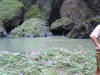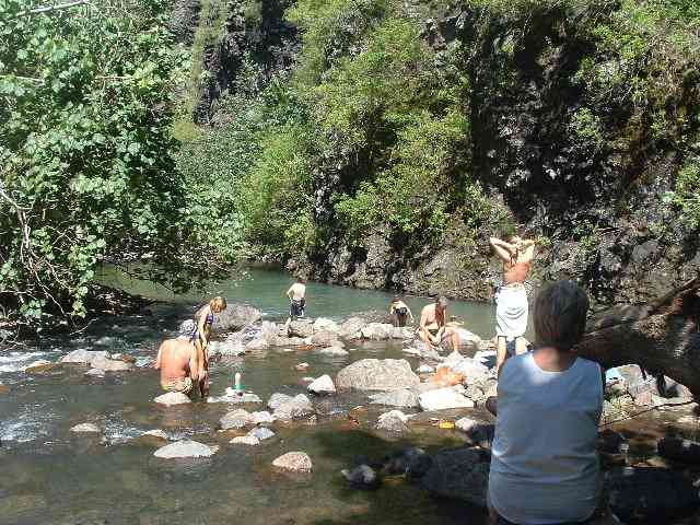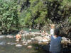 The main stream gets deep near the two places where you cross it (deep enough to swim comfortably in). The first time you have to go a bit upstream to reach the deep place, the second time, a bit downstream. The second crossing is a great place to swim, but a bit hard to reach. You have to walk over rocks and climb over branches (on a log I saw beetles mating) and there are rocks in the shallower water (but not sharp ones). But it is worth it. Once you get to where the stream goes against the cliff, I think it gets to at least eight feet deep. There are old pre-European walls and platforms everywhere. There are stacks of rocks marking the trail. There are three important things about the last swim: First, spray and the wind blow straight in your face so it is easier to swim backwards. Second, there are some rocks on the right side where there is a huge alcove into the canyon wall. You can stand on these rocks. You can also hang onto or sit on the point at the upper edge of the alcove where the rock flattens out and you can sit down. Third, there are boulders underwater with large gaps between them, so the depth varies from thigh-high to over your head. There are shrimp in the pool, but how they got there I have no idea. I guess they are the product of the same mysterious principle that allows tadpoles to appear in pools in Baja canyons after it rains. It was cold in the canyon with the waterfall, so we didn't spend long swimming there. We got dressed, and then walked down the trail looking for a swimming hole with sunlight. We didn't take long to find it.