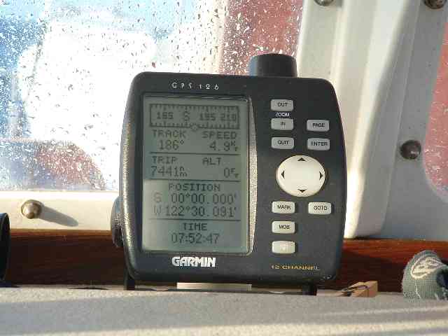 | We crossed the equator this morning at 07:53 PDT; our longitude was 122 30 W. Everyone got up to watch us cross the line, and I took the obligatory picture of the GPS with all zeros in the latitude field. Last night was beautiful, lots of stars, no radar targets, no rain. It's still a bit chilly at night; sitting in the damp for several hours at a time doesn't lead to a lot of body-generated heat. I'm still wearing my Henry Lloyd foulweather gear with polartech underneath, although admittedly I am barefoot! |