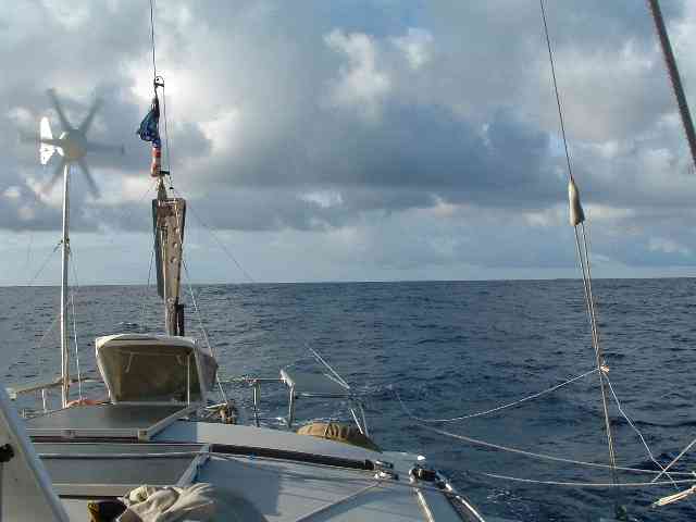 Logs & Stories - May 2005 - Part 1Eastern Pacific Crossing The following updates were received via SSB email Sunday, May 1, 2005 - Day 7At 4 p.m. mountain time, we were at 12 30 N 115 W. We jibed onto port tack today around 1:30, now heading due south, so we can avoid Ville de Toulouse Rock, a particularly remote high spot on the ocean floor found in 1871 by a boat with a 25-foot draft. We're also aiming at the Doldrums, now called the ITCZ (the Inter-tropical Convergence Zone), at the eastern end of what is reasonable to maintain the option of entering French Polynesia in either the Marquesas or Gambier Islands. The dolphins came back to visit us this afternoon, some of them leaping and spinning in the air. Karryn Monday, May 2, 2005 - Day 8Right now, we're at 10 25 N, 115 23 W and still heading south, more or less. This morning, after the Amigo Net we tried to ask Don (the weather guy) for the best place to cross the ITCZ if we were planning on going to the Gambiers instead of the Marquesas. We've seen an analysis Don had written stating the best place to cross the equator on a transit to the Marquesas is around W130. Since the Gambiers are further east and south, further into the SE trades, we were imagining that crossing the equator further east had merit. One of the weather complications, though, is that the ITCZ (and it's challenges with squalls and light, shifty winds) expands northward and southward as one gets closer to W120 or W115, where we are now. He seemed to say (over the SSB radio interference of two Asian-language conversations; it was hard to hear) to head south now instead of later. In addition, at that time, the every-six-hours ITCZ Forecast from the National Weather Service had a hole with no convection (thunderstorms) in it between 114 and 118 west, due south of where we are now. In their latest forecast, though, they went from no convection to a 480 mile-wide strip of convection between 110 W and 126 W. Of course, it could shrink just as fast, but going from having potential squalls several days away to suddenly having them maybe tomorrow is a bit unsettling. Nothing else new, though. Mostly, we roll along in 12-16 knots of breeze with the vane doing all the steering. We haven't seen a radar target since the first night out, only changed tacks once, and haven't had too much or too little wind --- yet! It's kind of scary, because I know I'm getting lulled into letting my guard down after over a week of this. Karryn Tuesday, May 3, 2005 - Day 9We've had grey skies and some rain but no squalls. We could see a few flashes of lightning very far away last night (put the PC and the handheld devices in the oven!). Another booby came and sat on our boat for a few hours, but eventually he was chased away (they're not boat-trained, to say the least). The wind has been down a bit this afternoon, so the boat's motion isn't quite as challenging as it has been. I'm not quite sure what it will be like, those first few steps on land... Karryn Bill here... We're nearing the Doldrums. It's Tuesday now, and we left La Cruz eight days ago, on a Monday. Eight very nice days, mind you; arguably among the best days of my life. As Garylee Johnson has said, "This can't be any better, only different." We'd been in Banderas Bay, mostly at La Cruz, for about two months working on final preparations and projects in anticipation of the eastern Pacific transit we're making now. Karryn focused mostly on buying things in town - food, supplies, marine parts, and so on - I focused on finishing up the myriad of little projects that scatter parts and tools around the boat. Things had come together for us during the last weekend in the anchorage - we'd gotten all the have-to projects done, the boat was fully stocked, we'd put away the tools, gotten out the navigation and safety gear, and reached closure with a few friends we'd connected with on the beach. We'd been tuned into the offshore weather reporting cycle for about a week, looking for a good opportunity to make our exit from Mexico. A passage to the South Pacific involves four distinct phases - 1) the initial 400-mile passage from Mexico to the NE trade winds, 2) a second segment of about equal distance in the relatively consistent NE trade winds, 3) a third segment, again around 400 miles, through the infamous doldrums (a.k.a. 'the ITCZ'), and 4) a final leg in the SE trade winds, the longest segment at around 1500 miles. (The numbers are a little different if you know you're going straight to the Marquesas Islands.) The Pacific weather system is, in essence, two huge, ocean-wide spirals, one in the northern hemisphere, the other in the southern, that butt up along the equator. Since the two spirals go in the same direction at the equator, the northern hemisphere portion has winds cycling clockwise -- easterly (that is, from the east) at the bottom, southerly on the western edge, westerly along the top and northerly along the eastern side next to the US and Mexico. The southern hemisphere portion operates in similar fashion, except everything is counter-clockwise. The winds in areas where weather is primarily dominated by these huge spirals are called trade winds, because the reliability of the winds there in terms of direction and strength made it economically more attractive to follow these routes as our planet developed the global transportation network in the 19th century - the name 'trade wind', I believe, is in reference to the development of trade routes. From a mechanical point of view, it's easiest to go from Point A to Point B if the wind is 1) from behind you (downwind), 2) doesn't stop (leaving you adrift until it returns), and 3) doesn't get so strong it generates scary environmental forces. The 'downwind' thing is a big deal. Because it's hard to go upwind in a sailboat - you can generally only go about 45-degrees from the direction of the wind, and the added impact of the waves pushing against the boat is substantial, especially a
