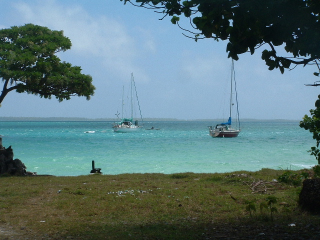 February 1, 2006 -- part 2 Bill: As we came though Tabuaeran's pass and into the lagoon, looking to the right we found three other yachts. One, Freya, we'd met at Christmas a month earlier. Aboard was Bjarne, a forty-year-old, youthfully handsome and athletic engineer from Victoria. It turns out we'd just missed seeing his wife, Barb -- she passed by us in darkness the night before returning to Christmas aboard another boat, on her way to the airport and a flight back to Canada to be with her father during an upcoming heart surgery. Giva, the second boat, is owned by a French Canadian couple, Valois and Gigi, who'd spent a decade in Hawaii. The boat's name interestingly comes from the concatenation of their names, her name first. Seems the right way to have done things since 'Vagi' inspires other imagery. During one Sunday afternoon potluck, after Val and I had consumed a few glasses of wine, I asked him about the name of his boat: How did they decide whose name should come first? He laughed hard and claimed it could have been even more interesting since their last name is Nadeau. We hardly know them at this point, but it appears they've done a nice job integrating into the community. Gigi has been giving quilting lessons to two of the more on-the-ball women on the island, one the island's nurse (who, we're told, has almost no access to medications), and one of the island's junior high school teachers.