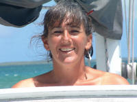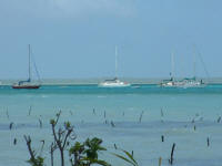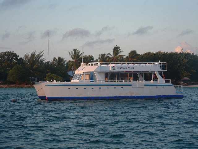 The third boat, Ilobaby, is perhaps the most interesting. It's owned by a Frenchman named Bruno, an on-and-off island inhabitant for the last two decades. Bruno's inspiration for his life is Bernard Moitessier, one of the world's most highly regarded singlehanded sailors, whom he met in France when he was fifteen, and I met in Tahiti when I was ten. Among Bernard's various accomplishments was to sail around the world one and a half times, non-stop and alone. He was competing in the first Around the World Singlehanded Race, held in 1968-9, and was winning but decided that, rather than complete the passage going north through the Atlantic back to France, he'd rather continue on to Tahiti. An enormous accomplishment, well before GPS, watermakers, roller-furling, LED lighting and numerous other navigational, safety and energy management devices that we take for granted today. Bernard died in the mid-90's but has been a frequent part of my life because of my family's relationship with his English translator, William Rodarmor (William was our crew aboard 'Soceress' for about two months when I was ten, and has been a recurring visitor in my parents' home ever since; I think of him as being one of my uncles). I recently read something about the end of Bernard's life, when he was making an effort to impact the problem of nuclear proliferation (I read a couple of years ago that the world has something like 28,000 of these devices, about a third owned by the US; seems a few more than necessary. Anyway, Bernard made a comment about it in 'Tamata and the Alliance', his last book: "We may as well admit that the human species is led by men who are half crazy. Let's hope that women will some day rouse themselves to preserve Life while waiting for Intelligence to awaken within the bosom of humanity." Quite the thought; I haven't seen it expressed elsewhere. February 3, 2006 Bill: Tabuaeran Atoll is actually a fairly unusual atoll. I suspect the majority of islands in the Pacific are atolls, rings of land and reef that are the living coral remnants of high islands that existed in their place eons ago. I've studied charts of dozens of atoll lagoons and most show deep basins, commonly with anchorage area depths in the 80-120 foot range, challenging for a number of reasons including requiring one to put out nearly 300 feet of chain to be safely secured. Christmas Island and Tabuaeran both have very shallow lagoons; most of Christmas is on the order of a meter deep, too shallow to transit, but here at Tabuaeran there is a square mile of area that has depths between ten and forty feet, making a large expanse for reasonable anchoring. Also, the atoll is fairly small, so when you're anchored at the downwind side of the lagoon the fetch doesn't generate waves that are monstrous. Many of the atolls in eastern Micronesia (where the Gilbert, Marshall and Caroline islands are located) are much larger, as much as thirty miles across, and I'm told that being on the downwind side can be excessively bouncy. Even so, this place has been anything but calm. We're anchored very close to the pass. Based on other atoll charts I've reviewed, the pass here is one of the easier ones to enter and exit. It's short, straight, reasonably wide and free of coral heads. Once you enter, the bottom shallows to about fifteen feet and there are a variety of places to anchor. The current can be an issue, though. The tidal range is only around two feet, but during maximum flow the current runs at about five knots. Not horrible for an atoll, mind you -- according to the guidebooks, Canton Atoll, west of here in the Phoenix Islands, has a current of about ten knots and slack water only lasts about fifteen minutes. I'm generally paranoid about the possibly of entering a lagoon under engine power and then having a problem that makes the diesel inoperable; we tend to only go places that can be exited under sail. This place qualifies. If we had an engine failure, we'd be able to pull out and make the transit to Tahiti, Hawaii, or Samoa for parts and repairs (all about a thousand miles away). On the beach immediately inside of us, on the point projecting into the pass, is the Norwegian Cruise Lines shore side facility. An odd place here on Tabuaeran, it looks like a park in the US -- small, neat buildings, a mown lawn. Along the water in front of it, there is a stretch of beach and a wooden dock. Anchored a short distance into the lagoon are three NCL power catamarans, each perhaps fifty feet long, painted white with blue trim, neat and well kept. Surveying the rest of the beach and lagoon outside our immediate area, you see nothing but water, beach and palm trees -- no anchored boats, no buildings. A pristine, gorgeous lagoon.