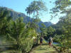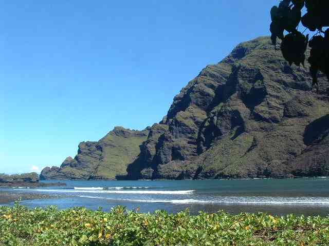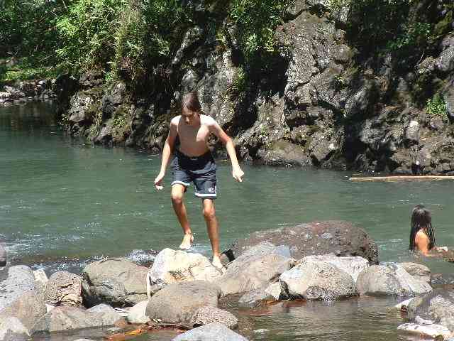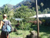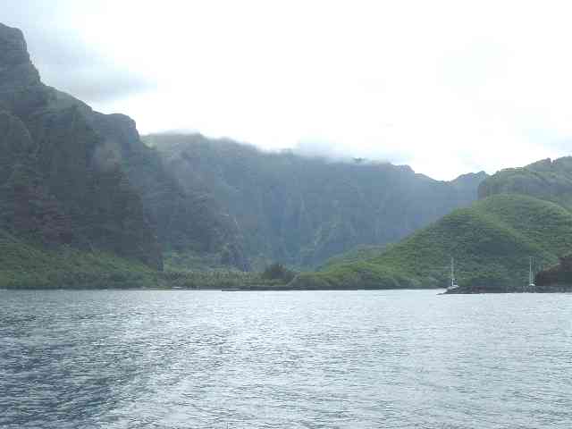 The bay does have no-nos, irritating bugs (sand flies) that bite without causing pain, or any sensation at all; however, some time later (12-36 hours), one discovers small red bumps that itch in an amazingly spectacular way as well. Except for Bill, who seems to have no reaction to them other than the red marks on his skin. We've been hitting him occasionally, to make up for what we're going through. Well, not really - we just want to. We're still doing well, although I've learned that when it rains, it pours and then it's very, very humid afterwards. I'm not a big fan of the humidity here; even after two summers and three years in Mexico, I find it very uncomfortable if there is sunshine and no breeze. Daniel's Bay has some other Marquesan name, but it's been informally renamed because of a man of legendary repute. Daniel, now in his 80's, has lived here much of his life and has become something of an icon to cruisers who are endlessly treated to his friendliness. The bay was a 'Survivor' location several years ago, and the show moved Daniel and his wife Antoinette to the other lobe of the bay, building them a new house. The view is incredible, but the real reason we moved here is to do a couple of repairs - one to the underwing, the other to one of the dinghies. The water in Daniel's bay is flatter, making Bill's repair work on the underwing a lot easier. The underwing, for those unfamiliar with the anatomy of a cruising trimaran, is the bottom side of the structure that connects the central hull to the outer hull, one on each side. During the passage from Mexico we cracked a stringer in the compartment just in front of the forward main strength bulkhead on the port side (my clothing cubby). We didn't note anything that could have caused the damage, but assume a wave thumped us hard enough to deflect the plywood skin and crack the stringer -- it's near the leading edge of the wing, so particularly vulnerable to that sort of thing. The wood I bought to sister the stringer was over $1 a foot for 4cm x 4cm -- I had to buy a whole 18 feet board even though we only needed eight feet! Also, during an evening outing we left the dinghy tied to a concrete wall and it ended up in a losing battle with an inflatable with an outboard engine - we left thinking the tide was low, but when we came back we found that the tide had fallen quite a bit further and in the process our plywood pram had gotten caught under the inflatable. So it needs repairs as well. We post the tides on our white board every day now! The access to shore at Taiohae Bay is not good, although better than many places in these islands, I understand -- a cement sea wall with either cut-in stairs or lousy ladders is the only option besides the beach. I don't like the beach when the tide is low or the swell is up, and the sea wall is obviously a bad place when all the other dinghies are inflatables with engines. Those things used to look so soft! Monday, June 13Jackson: We're back in Taiohae Bay now, after we spent two days in Anse Hakatea in Baie Taioa (referred to by cruisers as Daniel's Bay for the Marquesan who has lived there for decades). The entrance to the bay is very dramatic. At first the entrance is invisible and gradually appears as you get more west. On the west side of the bay are some huge volcanic cliffs, all of them more than a thousand feet high. The highest is about fifteen hundred feet. The valley behind the west part of the bay looks really flat (although it isn't), contrasting with the pinnacles that shoot up on the edge of it. And, instead of hearing cars and surf (like in Taiohae), you hear birds. There are two blowholes we know of on the west side (the cliff side). The interesting thing is that one is sideways. It is more a cave then a blowhole, but it blows out spray when a wave goes inside it. It is sideways because the spray comes out like the kind of garden hose end that has different modes (mist, jet, etc.). There is a nice-looking white beach in the east bay where you anchor (I don't know if it really is nice; Naomi is the only person on the boat who went there, and she is on another boat with other girls right now). The west bay where you don't anchor has a stream that you land in (where you land is more like a small inlet with dark sand). The stream is nice to swim in because it has mud on the bottom instead of sand, and since freshwater is lighter than salt, it tastes fresh on top and you can pretend that you are bathing in an unlimited supply of fresh water. On the last day we hiked with a bunch of other cruisers to the waterfall, which is something like the third highest in the world. The hike was a long walk which included wading through waist-high ferns and shrubs, jumping over pig-churned mud, crossing fast streams, and the fact that you can't actually see the waterfall (except from the path about a mile before the falls).