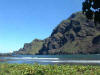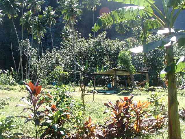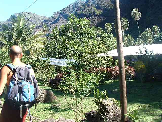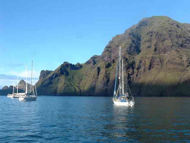 Logs & Stories - June 2005Marquesas Friday, June 3 Bill: We'd been trying to reconnect with Ishmael, our fruit benefactor, and Karryn and I had walked up to his house twice. The first time, he wasn't home, but on the second he and his family were taking their mid-day nap. We made introductions between Karryn and Ishmael's wife Tanya, then talked briefly. He invited us to come back to have lunch in a few days. Today was that lunch. All four of us hiked up the hill to Ishmael's, arriving around noon. Unfortunately, only Ishmael was home to greet us because his son had stepped on a nail at school and his foot had gotten an infection that made a trip to the hospital appropriate. He was in good condition, and Ishmael and Tanya were taking turns staying with him. Even so, Ishmael had gone to great effort to make and have lunch with us, and we were treated to a salad with shrimp, cabbage, carrots and potatoes, chicken cooked with green papayas, onions and coconut milk, rice, grilled chicken, and somewhere along the way there was breadfruit. The food was all very good, but I had a sense that Ishmael was disappointed at our appetites; judging by the amount of food there, I think the average portion size is bigger than what we eat in a meal. We finished up with homemade carasol ice cream along with a fruit salad served in coconut halves that Ishmael whacked in half right before serving it up. As our lunch conversation unfolded, we got a better sense of his family history. Ishmael, who in spite of his name is very Polynesian looking, is the grandson of a German immigrant that arrived in paradise around the end of WWII. He was born in Tahiti, but grew up on Nuka Hiva. He'd returned to Tahiti for high school, then spent six years working in the island's hotels and resorts. He'd learned to speak English, made a trip to France, married, and returned home with a small family. It turns out that Ishmael has nine brothers and sisters. One brother, a communist, lives next door. Another brother, his face half covered in tattoos, lives on the remote north side of the island in Anaho Bay, reputed to be the quietest anchorage in the Marquesas. One sister lives on an adjoining lot and two others live in Paris. I'm hoping we'll be able to meet the ones who live here as we explore the island. One of the things I've been curious about is Nuku Hiva's food and water supplies. We've been told repeatedly that Taiohae's water supply is undrinkable, but I hadn't seen any evidence of the five-gallon water jugs that are so common in Mexico, which frequently has similar issues. Ishmael informed us that he used his uncle's truck (the same one he'd given us the ride in earlier) to drive over to Taipaivai, the next valley to the east, to collect good water. One of the curiosities about the food supply is that the food in the stores is so expensive. This makes intuitive sense to me, since packaged goods manufactured elsewhere take a lot of time, effort, equipment and energy to transport themselves to Taiohae's shelves. But the lack of an economic structure here made me question how locals would come up with money to buy food. From talking to Ishmael, though, it appears that the food mechanism here works very differently than I'm accustomed to. In the US, most of the good flows through retail stores -- my impression is that the impact of non-business gardening, fishing, ranching, winemaking, etc., is pretty minimal. This place appears to be a bit different. One of the things that is truly amazing is the number of food-bearing trees you see, most of which seem pretty laden with fruit. At some point in the past, this island fed 30,000 folks, over ten times the current population, and I suspect these long-gone people planted a lot of the trees I'm seeing. Also, my impression is that the Marquesas Islands also have many wild pigs and goats that the locals hunt - in fact, several guides have mentioned that the overpopulation of goats on some of the islands has been substantial enough to lead to environmental damage. Probably just like everybody else's, Ishmael's yard provides a great deal - bananas, limes, papayas, pomplemouse, breadfruit and the ever-present Hogtestical fruit (carasol). He also has chickens and a pig in the back yard. They sent us home with eggs that were even better than the local ones sold in the stores. In addition, his family has 300 cattle that are kept up on the plateau in the middle of the island. Generally, it appears that these people live a more subsistence existence, where the food they consume comes from immediately around them, and that the presence of family members, friends and neighbors creates a social environment where folks get together and do things communally. With only four small stores in Taiohae, it's hard for me to imagine that the amount of food flowing through retail is significant. One of the things I'm continually mindful of is that I've been able to share a bit in this experience by virtue of Ishmael's generosity and command of the English language. In the course of our conversation, Ishmael mentioned that there was a commercial farm on the north end of the island that was providing most of the vegetables that are sold at the stores in Taiohae. From what I've seen of Nuku Hiva so far, the soil here is pretty full of rocks - the stone walls you see everywhere are a testament to that. I'm wondering if the north side of the island looks different than what I'm seeing on the south side. Thursday, June 10Karryn:
