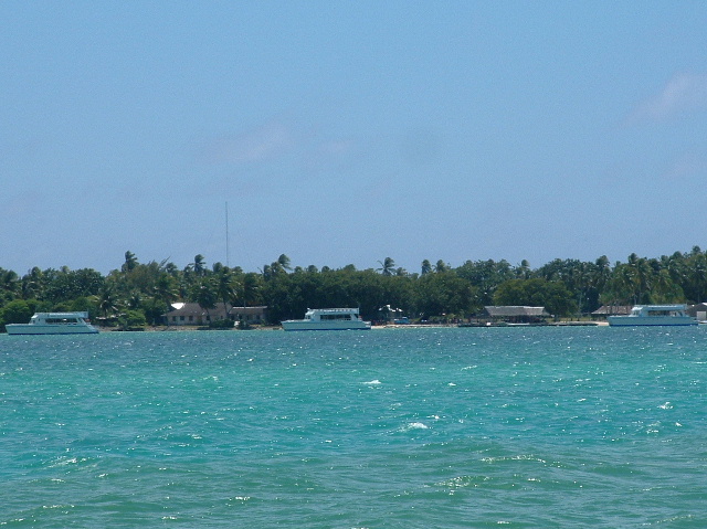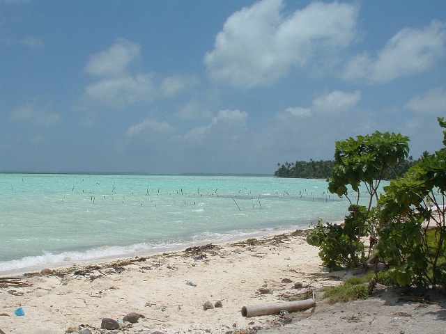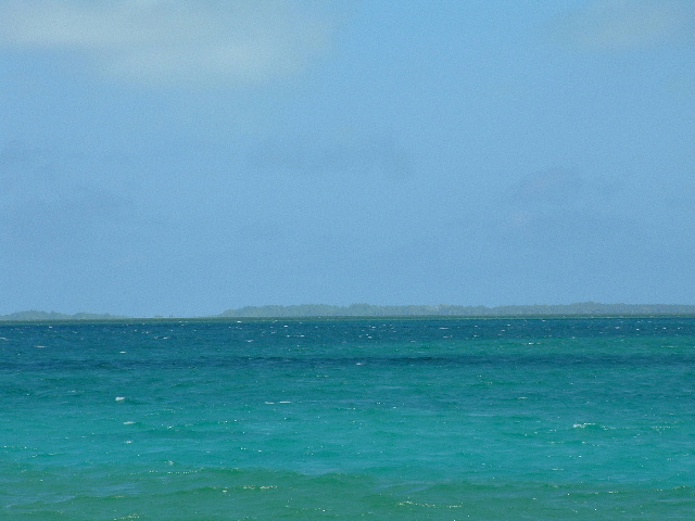 The third boat, Ilobaby, is perhaps the most interesting. It's owned by a Frenchman named Bruno, an on-and-off island inhabitant for the last two decades. Bruno's inspiration for his life is Bernard Moitessier, one of the world's most highly regarded singlehanded sailors, whom he met in France when he was fifteen, and I met in Tahiti when I was ten. Among Bernard's various accomplishments was to sail around the world one and a half times, non-stop and alone. He was competing in the first Around the World Singlehanded Race, held in 1968-9, and was winning but decided that, rather than complete the passage going north through the Atlantic back to France, he'd rather continue on to Tahiti. An enormous accomplishment, well before GPS, watermakers, roller-furling, LED lighting and numerous other navigational, safety and energy management devices that we take for granted today. Bernard died in the mid-90's but has been a frequent part of my life because of my family's relationship with his English translator, William Rodarmor (William was our crew aboard 'Soceress' for about two months when I was ten, and has been a recurring visitor in my parents' home ever since; I think of him as being one of my uncles). I recently read something about the end of Bernard's life, when he was making an effort to impact the problem of nuclear proliferation (I read a couple of years ago that the world has something like 28,000 of these devices, about a third owned by the US; seems a few more than necessary. Anyway, Bernard made a comment about it in 'Tamata and the Alliance', his last book: "We may as well admit that the human species is led by men who are half crazy. Let's hope that women will some day rouse themselves to preserve Life while waiting for Intelligence to awaken within the bosom of humanity." Quite the thought; I haven't seen it expressed elsewhere. February 3, 2006 Bill: Tabuaeran Atoll is actually a fairly unusual atoll. I suspect the majority of islands in the Pacific are atolls, rings of land and reef that are the living coral remnants of high islands that existed in their place eons ago. I've studied charts of dozens of atoll lagoons and most show deep basins, commonly with anchorage area depths in the 80-120 foot range, challenging for a number of reasons including requiring one to put out nearly 300 feet of chain to be safely secured. Christmas Island and Tabuaeran both have very shallow lagoons; most of Christmas is on the order of a meter deep, too shallow to transit, but here at Tabuaeran there is a square mile of area that has depths between ten and forty feet, making a large expanse for reasonable anchoring. Also, the atoll is fairly small, so when you're anchored at the downwind side of the lagoon the fetch doesn't generate waves that are monstrous. Many of the atolls in eastern Micronesia (where the Gilbert, Marshall and Caroline islands are located) are much larger, as much as thirty miles across, and I'm told that being on the downwind side can be excessively bouncy. Even so, this place has been anything but calm. We're anchored very close to the pass. Based on other atoll charts I've reviewed, the pass here is one of the easier ones to enter and exit. It's short, straight, reasonably wide and free of coral heads. Once you enter, the bottom shallows to about fifteen feet and there are a variety of places to anchor. The current can be an issue, though. The tidal range is only around two feet, but during maximum flow the current runs at about five knots. Not horrible for an atoll, mind you -- according to the guidebooks, Canton Atoll, west of here in the Phoenix Islands, has a current of about ten knots and slack water only lasts about fifteen minutes. I'm generally paranoid about the possibly of entering a lagoon under engine power and then having a problem that makes the diesel inoperable; we tend to only go places that can be exited under sail. This place qualifies. If we had an engine failure, we'd be able to pull out and make the transit to Tahiti, Hawaii, or Samoa for parts and repairs (all about a thousand miles away). On the beach immediately inside of us, on the point projecting into the pass, is the Norwegian Cruise Lines shore side facility. An odd place here on Tabuaeran, it looks like a park in the US -- small, neat buildings, a mown lawn. Along the water in front of it, there is a stretch of beach and a wooden dock. Anchored a short distance into the lagoon are three NCL power catamarans, each perhaps fifty feet long, painted white with blue trim, neat and well kept. Surveying the rest of the beach and lagoon outside our immediate area, you see nothing but water, beach and palm trees -- no anchored boats, no buildings. A pristine, gorgeous lagoon.