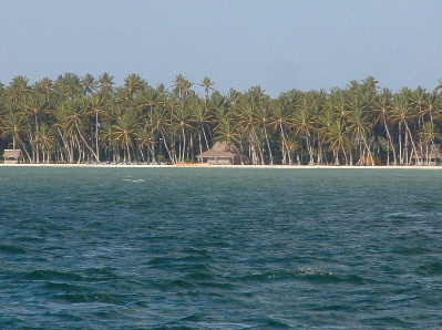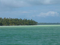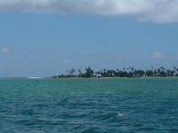 Logs & Stories - February 2006Fanning IslandFebruary 1, 2006 -- part 1 Bill: We're here at scenic Fanning Island now, a gorgeous spot. The place actually has a more real, more appropriate Kiribati name: Tabuaeran Atoll. Remote and exotic, well off the beaten path in spite of its proximity to Hawaii, 1100 miles to the north. This region, the Line Islands, is one of the more isolated areas of the Pacific, just a few scattered atolls with an aggregate population of around ten thousand folks. Christmas Island, in spite of being well known -- made famous by the Andrews Sisters' 'Christmas on Christmas Island', and British nuclear testing done there in the middle of the last century -- was actually pretty remote, too, until now about the most remote place we've spent any time at. [Editor's Note: There are actually two Christmas Islands; the other one is in the Indian Ocean between Australia and Indonesia, and is a colony of Australia, due no doubt to its phosphate deposits.] Tabuaeran is REALLY remote. The supply boat hasn't made it here in eight months, and there are no airplanes coming into the now overgrown landing field. We're told the island is running seriously short on basic things like antibiotics, soap, laundry detergent, thread, lighters, gasoline, tobacco and beer. The only supplies are coming in via a cruise ship operated by Norwegian Cruise Lines, which lands 1500 tourists for an afternoon every other week, briefly doubling the island's population. At this point we've only been here on Tabuaeran a couple of days. The passage from Christmas was really wonderful: a day of blissful reaching in medium air conditions. Kind'a like our passage from Mexico to the Marquesas, only with a small fraction of the duration. Coming into the pass here was pretty straightforward, too. We timed the passage so we'd arrive slightly before slack water, and entered the pass at mid-day with about a knot and a half of current against us. A couple of months back, we came into Suwarrow in the northern Cook Islands in similar tidal circumstances, but the pass and the lagoon were trickier, having more reefs to run into. Also, at that time, a big nasty squall moved in and obscured all the underwater obstacles (yikes!). Here, a tiny squall passed through first, and then we were able to enter with poor visibility, shallow and hard coral patches difficult if not impossible to spot. Under the noon-day sun, entering the lagoon was visually spectacular -- fringed by a band of tall green palm trees hovering over a white line of coral beach, the sparkling, light green saltwater lake extended out three miles toward the atoll's far shore, a giant blue-green gem under a bright sun.