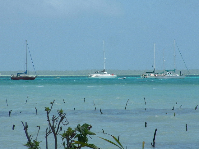 February 1, 2006 -- part 2 Bill: As we came though Tabuaeran's pass and into the lagoon, looking to the right we found three other yachts. One, Freya, we'd met at Christmas a month earlier. Aboard was Bjarne, a forty-year-old, youthfully handsome and athletic engineer from Victoria. It turns out we'd just missed seeing his wife, Barb -- she passed by us in darkness the night before returning to Christmas aboard another boat, on her way to the airport and a flight back to Canada to be with her father during an upcoming heart surgery. Giva, the second boat, is owned by a French Canadian couple, Valois and Gigi, who'd spent a decade in Hawaii. The boat's name interestingly comes from the concatenation of their names, her name first. Seems the right way to have done things since 'Vagi' inspires other imagery. During one Sunday afternoon potluck, after Val and I had consumed a few glasses of wine, I asked him about the name of his boat: How did they decide whose name should come first? He laughed hard and claimed it could have been even more interesting since their last name is Nadeau. We hardly know them at this point, but it appears they've done a nice job integrating into the community. Gigi has been giving quilting lessons to two of the more on-the-ball women on the island, one the island's nurse (who, we're told, has almost no access to medications), and one of the island's junior high school teachers.