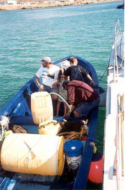 planing skiff powered by a 75-hp outboard. Here he is siphoning 20 gallons